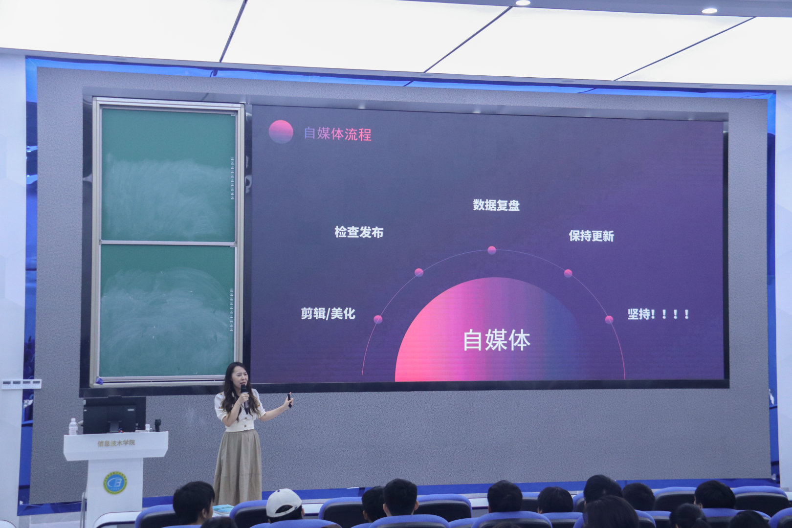 4月11日下午,“新媒体技术劳动工坊第四期公益讲座”在4-215成功举办。本次讲座以“自媒体入门白皮书”为主题展开,由海南英立大数据服务有限公司项目经理王倩老师担任主讲人,来自全校各个专业共计220余名同学共同聆听了此次讲座。