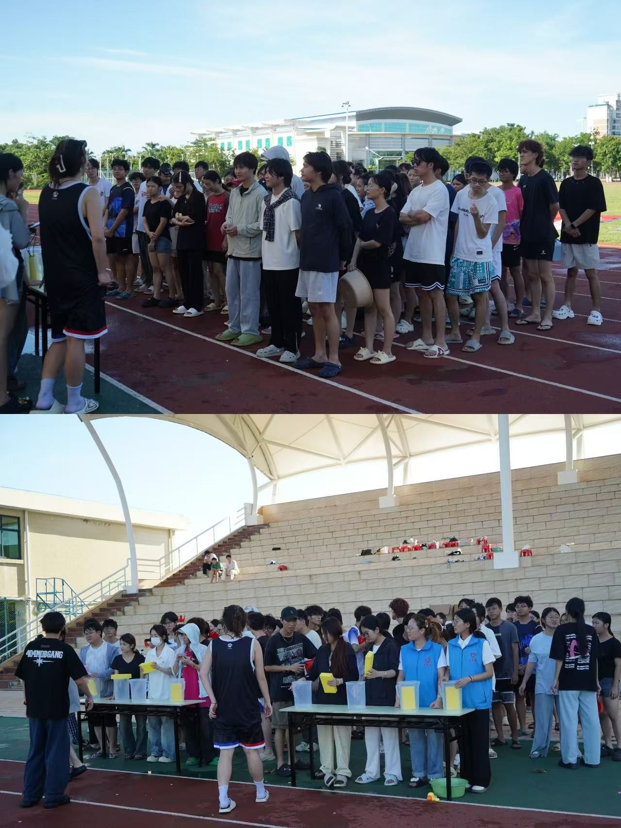 自备的呲水枪、水盆齐上阵,有人被追着满场跑,有人组队围攻“敌方大将”,水花糊满全身也不管,反正笑声早就冲出操场啦~连路过的风都带着甜味,这才是夏天该有的样子嘛!