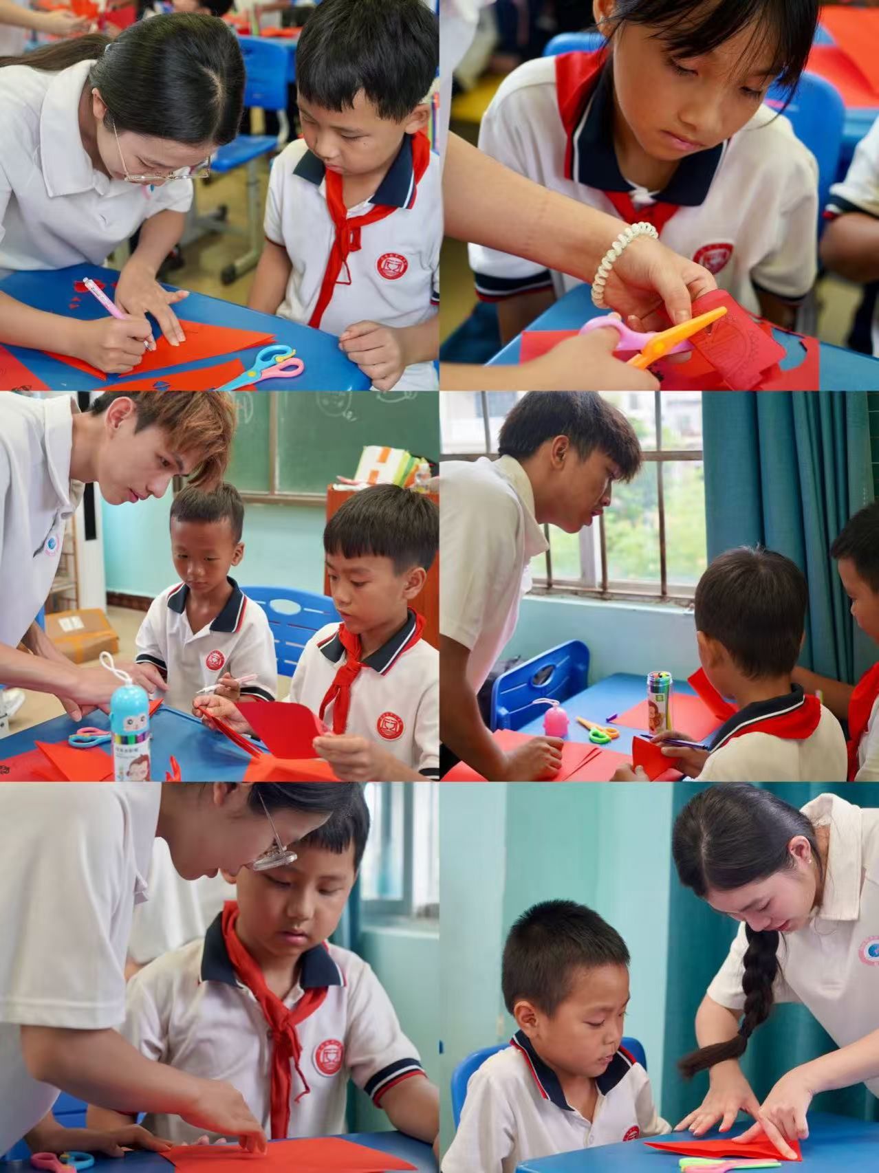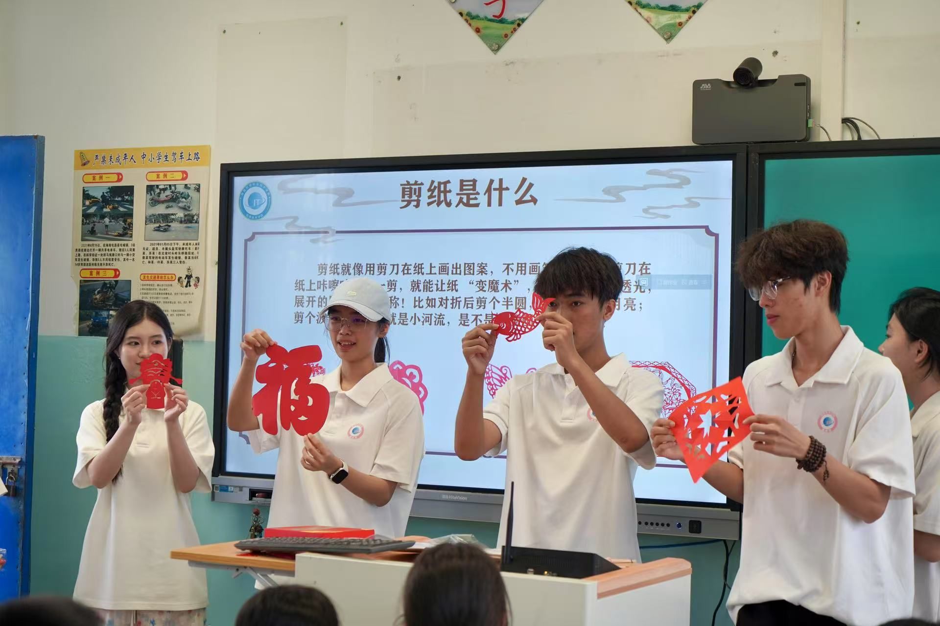 在 “剪纸的奇幻空间” 体验中,实践队围绕红纸和宣纸展开教学。他们先讲解了红纸的文化属性,从春节时的窗花到婚庆中的装饰,传递出其中蕴含的吉祥寓意;接着介绍了宣纸的工艺优势,并分享了绘图技巧。在进行安全提示后,实践队成员示范了对折法等剪纸技法,孩子们纷纷动手创作。他们剪出的图案有的质朴自然,有的精巧细致,在裁纸的过程中,孩子们深刻领悟到传统技艺中 “慢工出细活” 的匠心精神。