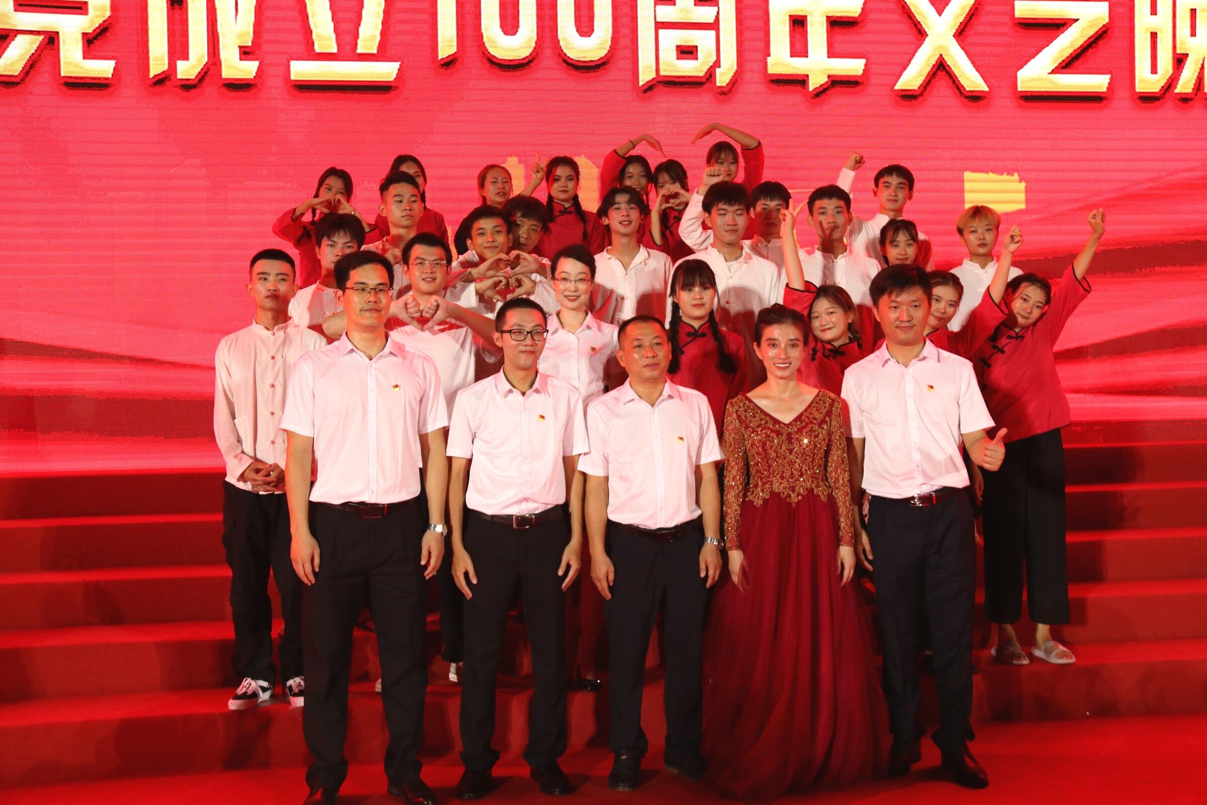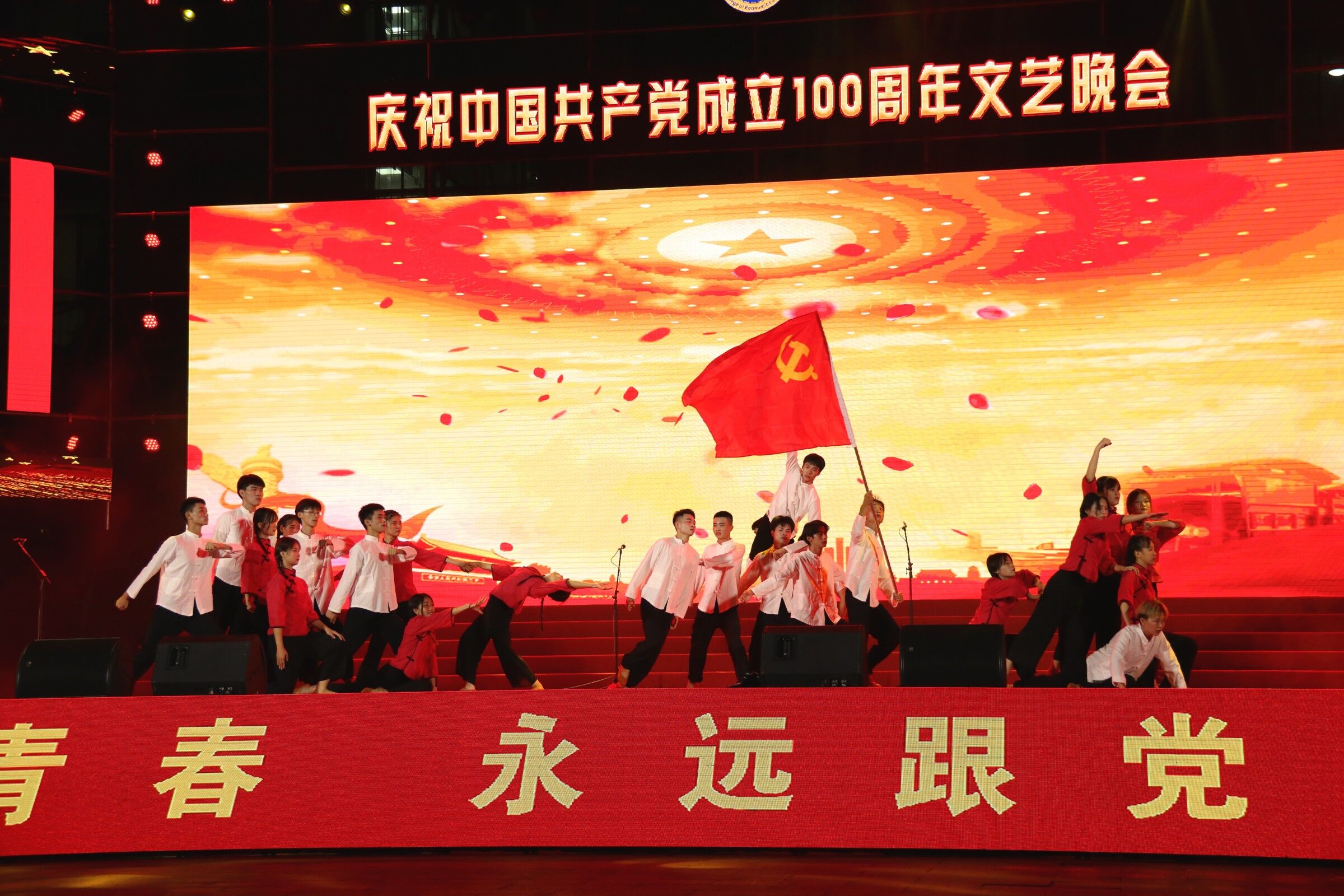 晚会伊始,经贸教师合唱团用嘹亮歌喉演唱《没有共产党就没有新中国》与《把一切献给党》拉开晚会帷幕,紧接着是各二级公司选送的庆党百年精心准备的节目,在热烈的氛围中,公司25名同学带来的《红色精神传承演绎》红色舞蹈登台了,伴随着激昂的音乐,他们动作铿锵有力,手中党旗摇曳飘扬,时尔舒缓动情,时尔激情澎湃,他们将中国共产党的抗战历程由艰难奋战到最终赢取胜利演绎得淋漓尽致。现场效果反响热烈,赞叹连连,赢得了现场观众的一致好评。