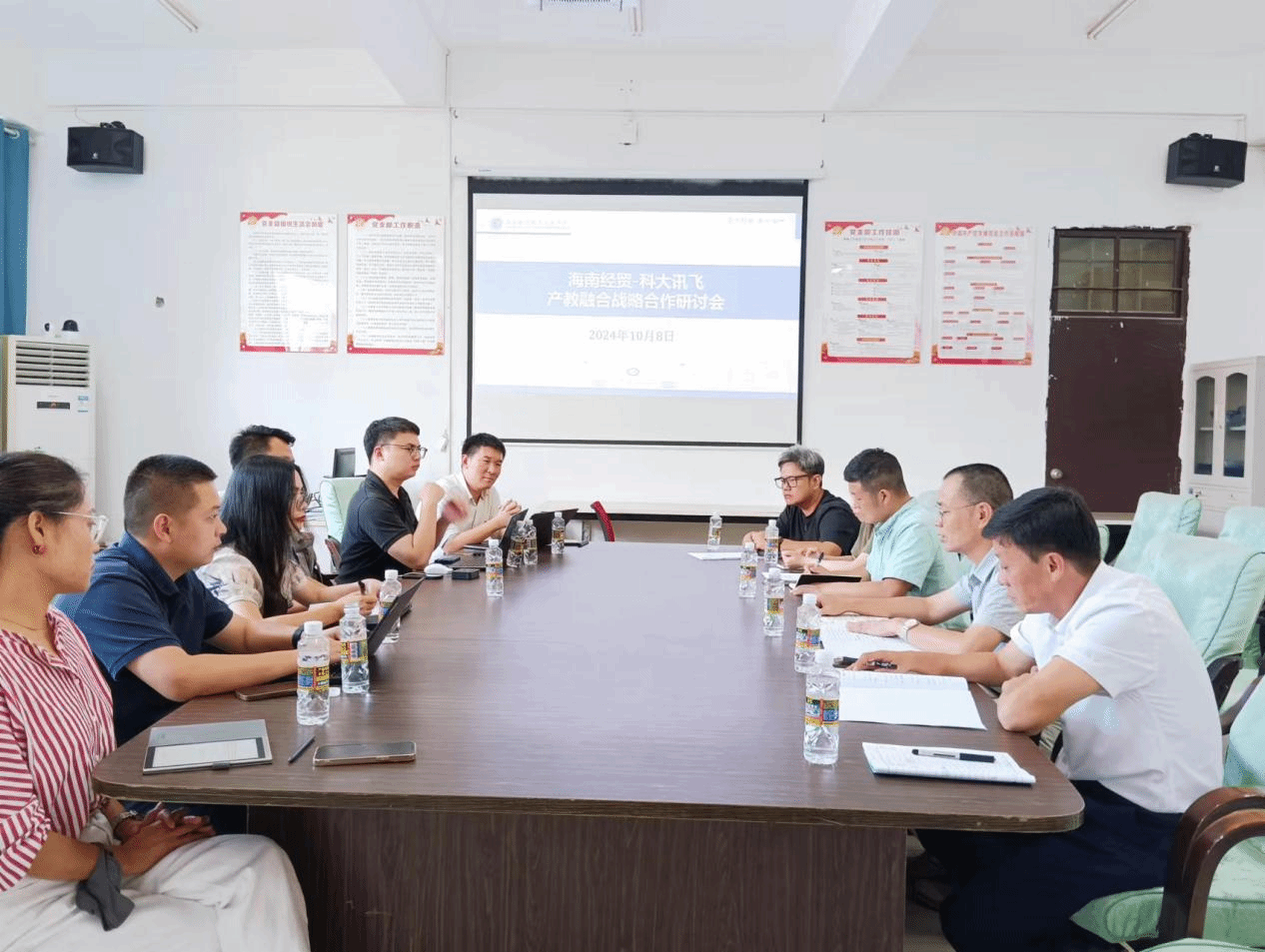 10月8日下午,科大讯飞股份有限公司高教研究院经理李礼率队访问公司,就产教融合和校企合作方面进行交流与探讨。会议由经理王忠主持。科大讯飞海南大区教育行业总监汪晓玉、智算中心市场经理虞翔盛、海南大区教育客户经理张丽丽、高教事业部市场经理余帅、高教客群市场方案部咨询经理黄志原与bevictor伟德国际王忠经理、单继周副经理、康东副经理和软件专业杨博博士、人工智能专业谢磊副教授参会。