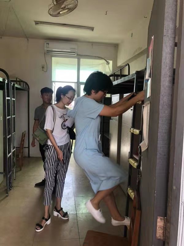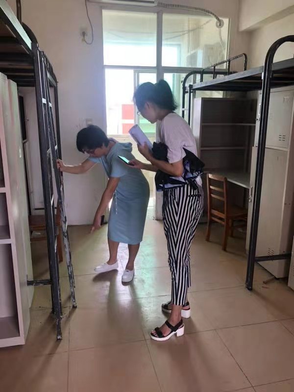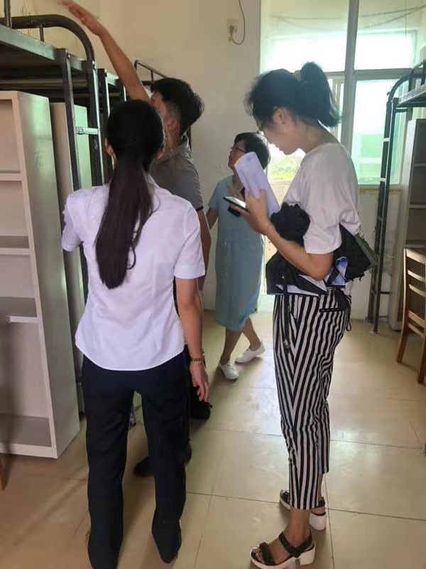 2019年8月30日(青年媒体中心报道)讯,公司新学年实施高等教育扩招政策,为给同学们更舒适便利的住宿环境,各公司配合公司进行了宿舍搬迁改造工作。8月30日下午,为了解员工宿舍的搬迁进展,以及排查员工宿舍的安全隐患工作,公司党总支书记陈继敏、党总支副书记陈亚芳、学工办主任梁其钰、18级辅导员代晓明与18级辅导员郭蓉佳等多位领导老师深入员工公寓进行走访。