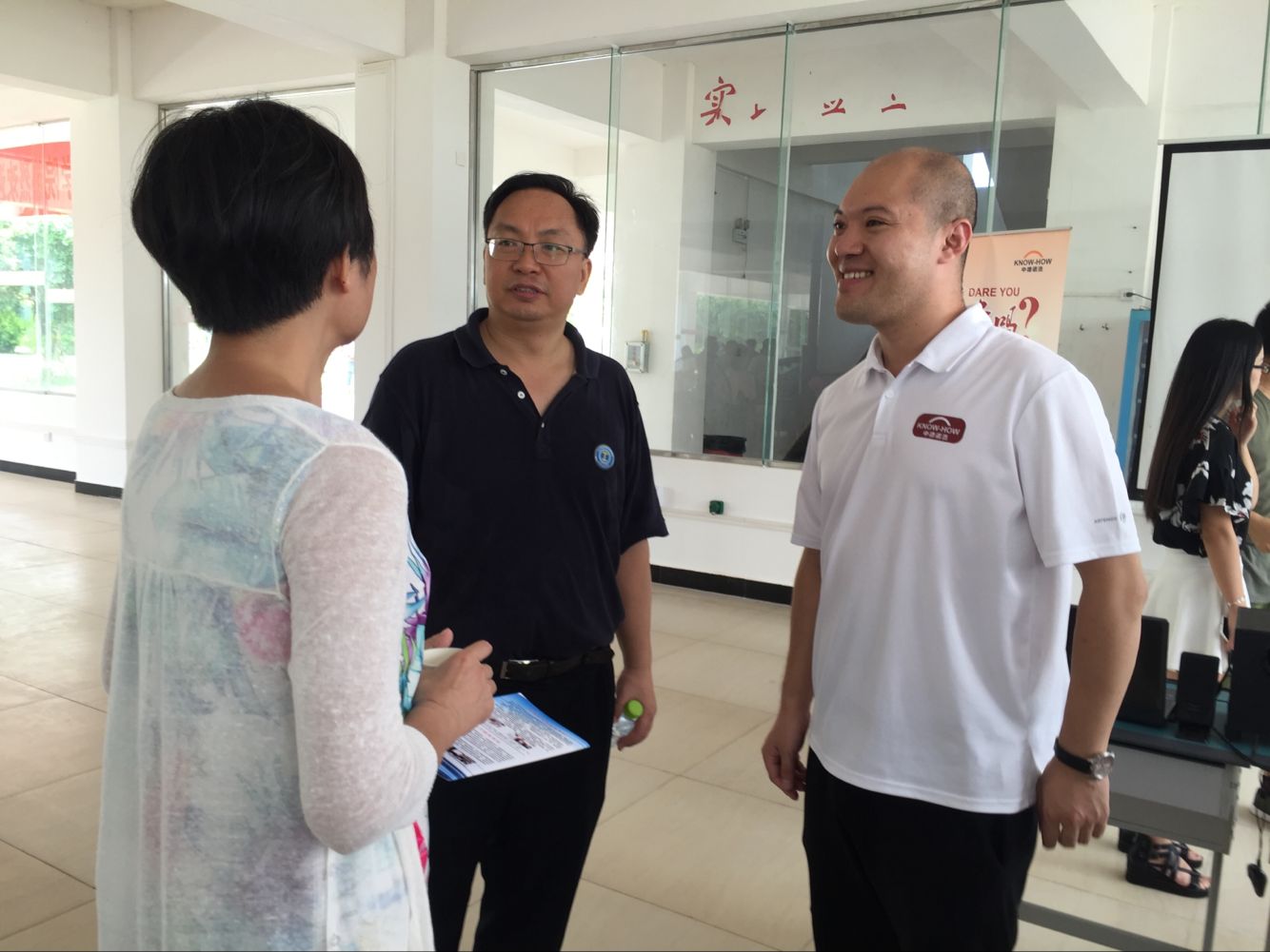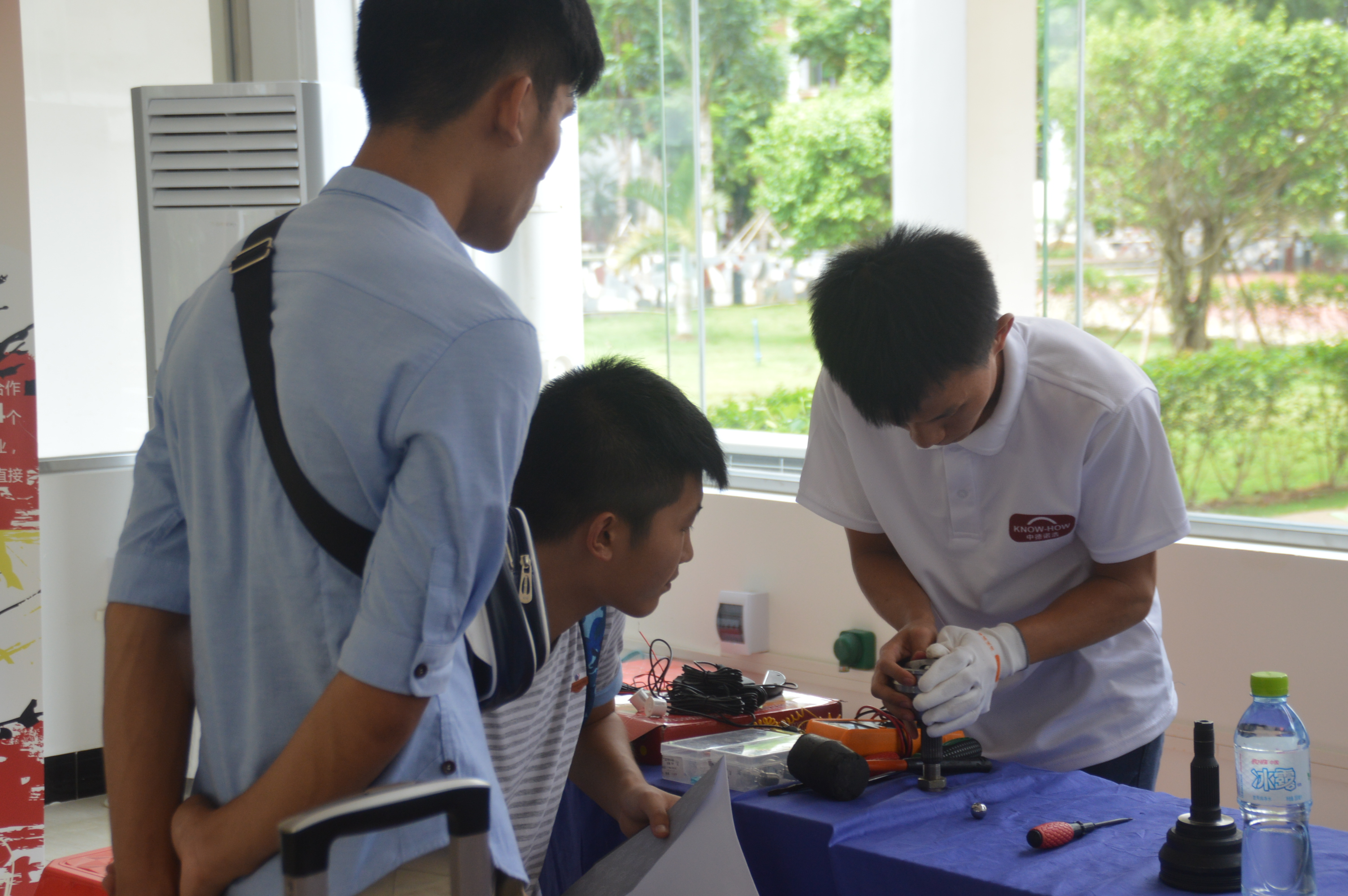 工程技术公司在今年的“迎新生”安排活动中可谓创意多多。首先是在主会场霸气摆放我们的教学用车,还展示出了许多汽车模型,给新生眼前一亮的感觉。在新生注册环节,工程技术公司独树一帜,针对特色专业、以及男女生人数差距较大等特点分别设置了“女生”、“男生”,“中德诺浩”三个新生报到点,不仅有效缓解了新生“扎堆儿”报到的情况,同时更加突出了公司对于专业特色的宣传推广。其中,“中德诺浩”专业还在会场布置了大屏幕,向新生们展示了本专业的专业学习内容,教学方式以及发展前景,更有学长现场演示实操,向“迷弟”们展示他们的“洪荒之力”,小鲜肉们简直兴趣爆棚。在新生注册点东侧,咱们的专业老师们也都前来助阵,帮助新生解答专业疑惑,并且通过海报展示公司员工的参赛成果,帮助新生们树立专业方向。