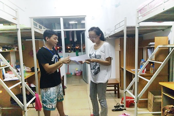 9月7日讯(工程技术公司 李京京报道) 为了解公司新学期员工返校、宿舍用电安全及文明卫生情况,9月6日晚20点,由工程技术公司14级辅导员代晓明老师带队,第十届团总支员工会主席魏锴、副主席黄丹及公寓部全体成员等组成的检查小组对13、14级各班员工宿舍进行了走访,进一步的了解公司员工的学习、生活和思想状况。