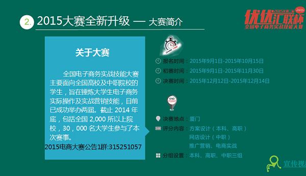 接着,李顾问对2015大赛中全新升级的品牌直营店、亲友团及比赛规则(初赛成绩=方案设计或网店建设20%+营销推广50%+电商实战< 销售额>30%;决赛总成绩=初赛成绩70%+决赛简报分析30%)、奖项设置(优优校园之星团队奖=50000元+纪念品+证书;特等奖=10000元+纪念品+证书<2 名>;一等奖=5000元+纪念品+证书<6 名>;二等奖=3000元+纪念品+证书<27 名>)、创业基金(免息贷款、多企联合、基金管理、基金申请)、品牌支持(厦门乐麦电子商务有限公司、厦门米推信息技术有限公司、厦门安泰迪智家居有限公司、食养臻品、兰亭科技股份有限公司、厦门久享信息科技、厦门优之点投资有限公司、惠博贸易、一泰.酷家)、货源支持进行了讲解说明。