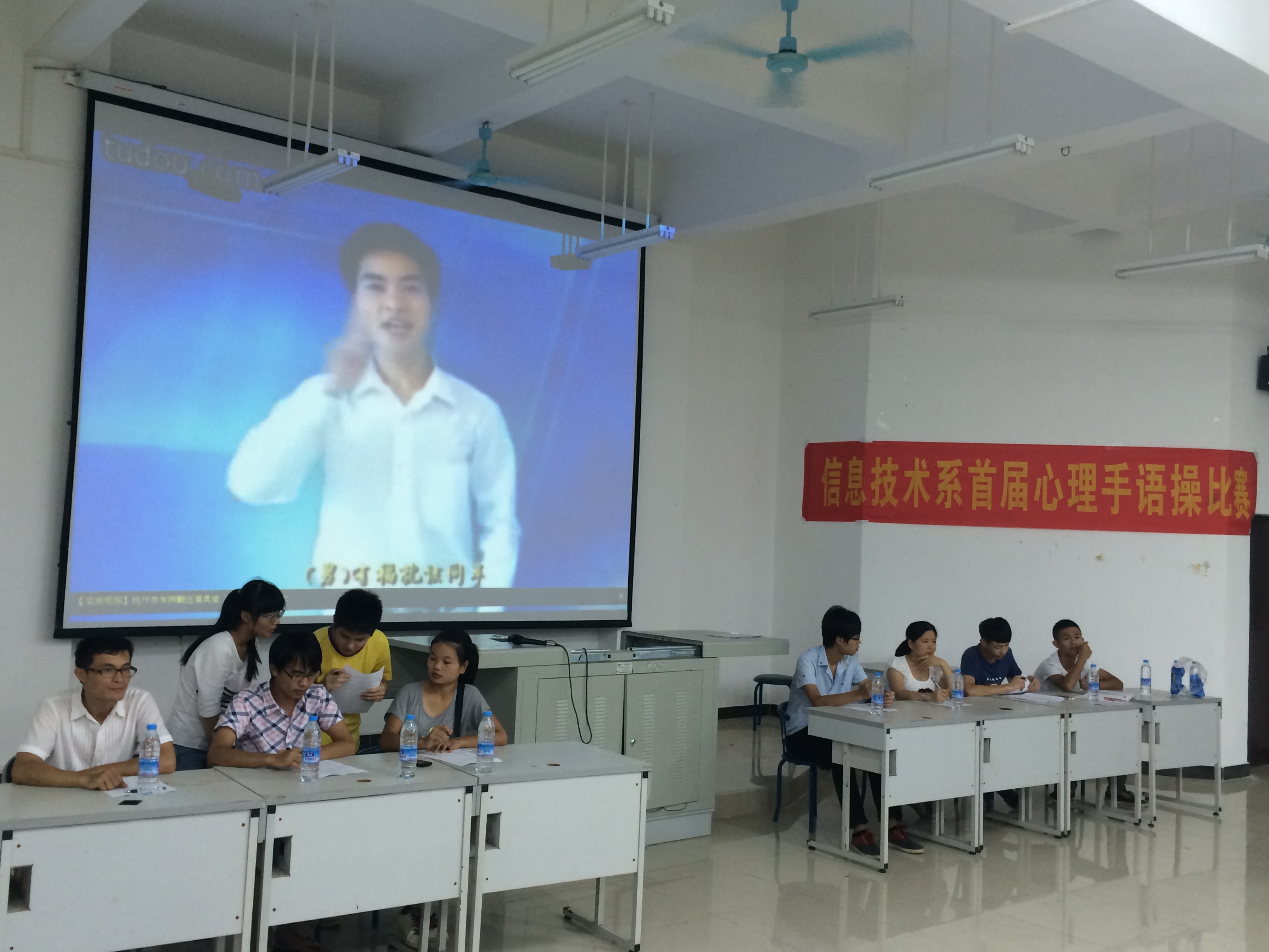 本系6月13日讯(信息技术系 钟超报道)“让心灵在双手中舞动,让关爱于指尖处绽放”,由12级员工会心理部部长谭业同学组织策划的手语操比赛,于6月12日晚7:30分,心理手语操比赛在本系2栋教学楼408教室内举行。本系13级全体新生共同参与了本次手语操比赛。此次比赛评委从每班选出一个代表,然后进行综合评分,本着“公平、公正、公开”的原则,一旦到自己班的比赛队伍,代表本班的评委将不能参与评分。本系党总支书记陈继敏出席了比赛并担任观察员,陈继敏书记在比赛现场发表了重要讲话,他指出:“手语操作为一种表达思想情感的特殊方式,是集体参与进来的心理保健操。员工在优美的旋律、抒情的动作中,感情与意境相融合,肢体语言与心理情感相协调,达到强身健体同时用肢体宣泄法把自己身体的许多情绪,尤其是负性情绪释放出来,愉悦身心、提高自信心,感悟生活的美好、体味人生的真谛,达到内在与外部的完美统一”。