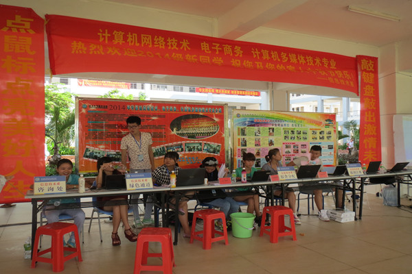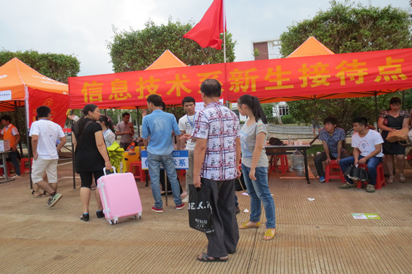 我系迎新者遍及在公交车站点、公司大门口、二栋楼下等地摆出服务点,为新生注册提供便利。学长学姐们带领新生进行资格审核、缴费、系部报道、购买军训服、办理一卡通,最后再把新生带到员工公寓宿舍。引导路途中,积极分子们冒着炎炎烈日帮忙复印各种需要的文件,帮忙提行李(特别是行李多的家长员工以及弱小的女生等)直至宿舍里面,当然还包括向他们介绍公司的一些概况,以及所学专业的一些情况,其中还耐心解答着新生和家长的各种问题,尽心尽力、尽职尽责。