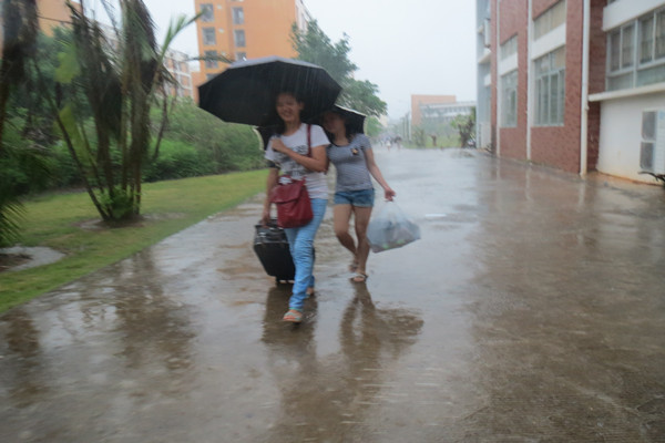 一个又一个的新生接踵而至,整个校园里雷声,雨声,人言声,声声入耳。在如此人雨繁杂的情况下,却在迎新者们的辛勤调解帮助下有条不紊地进行。天公不作美,冒雨迎新生;顶风涉水多壮志,敢叫狂雨变小雨。