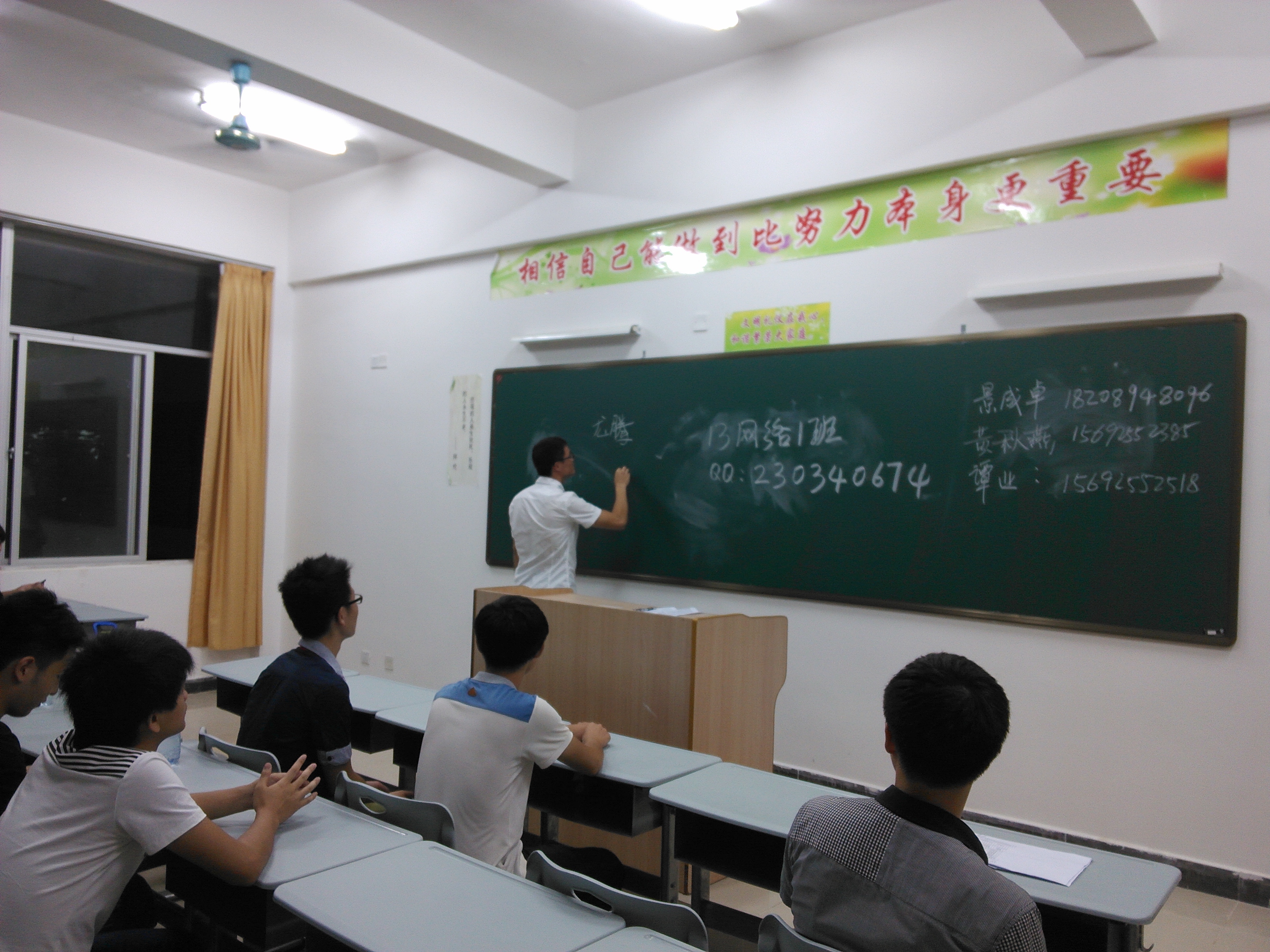 (信息技术系宣教部报道)随着2013级新生报到注册工作的顺利结束,为了使2013级新生对即将开始的大学学习和生活有进一步了解,信息技术系各专业班级于9月8日20点30分整在二栋教学楼5楼的各个教室分别举行了新生辅导员见面会。信息技术系2013级辅导员龙腾老师逐一参加了我系各个专业班级的见面会,并正式向同学们介绍了未来将陪伴大家度过美好大学时光的各班的代理班主任们。随后,辅导员龙腾老师对新同学的到来表示热烈的欢迎。对开学典礼,师生见面会、专业介绍,安全教育、系部领导走访寝室、图书馆参观、员工手册专题讲座、新老生交流会、入学体检、直通本科讲座、老员工党团知识讲座、新生班级才艺展示、心理健康讲座、新生军训动员等活动的注意事项进行了解读。