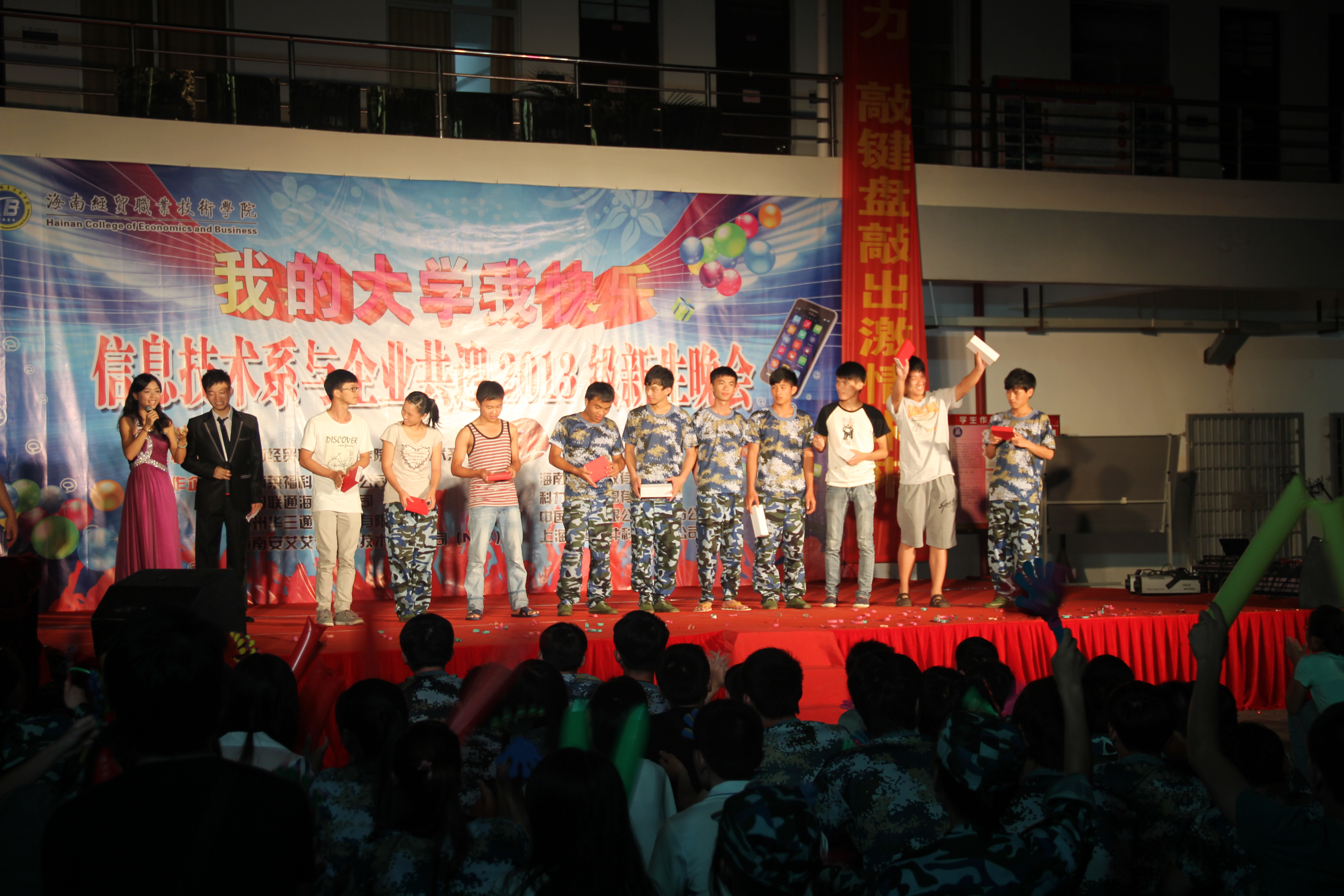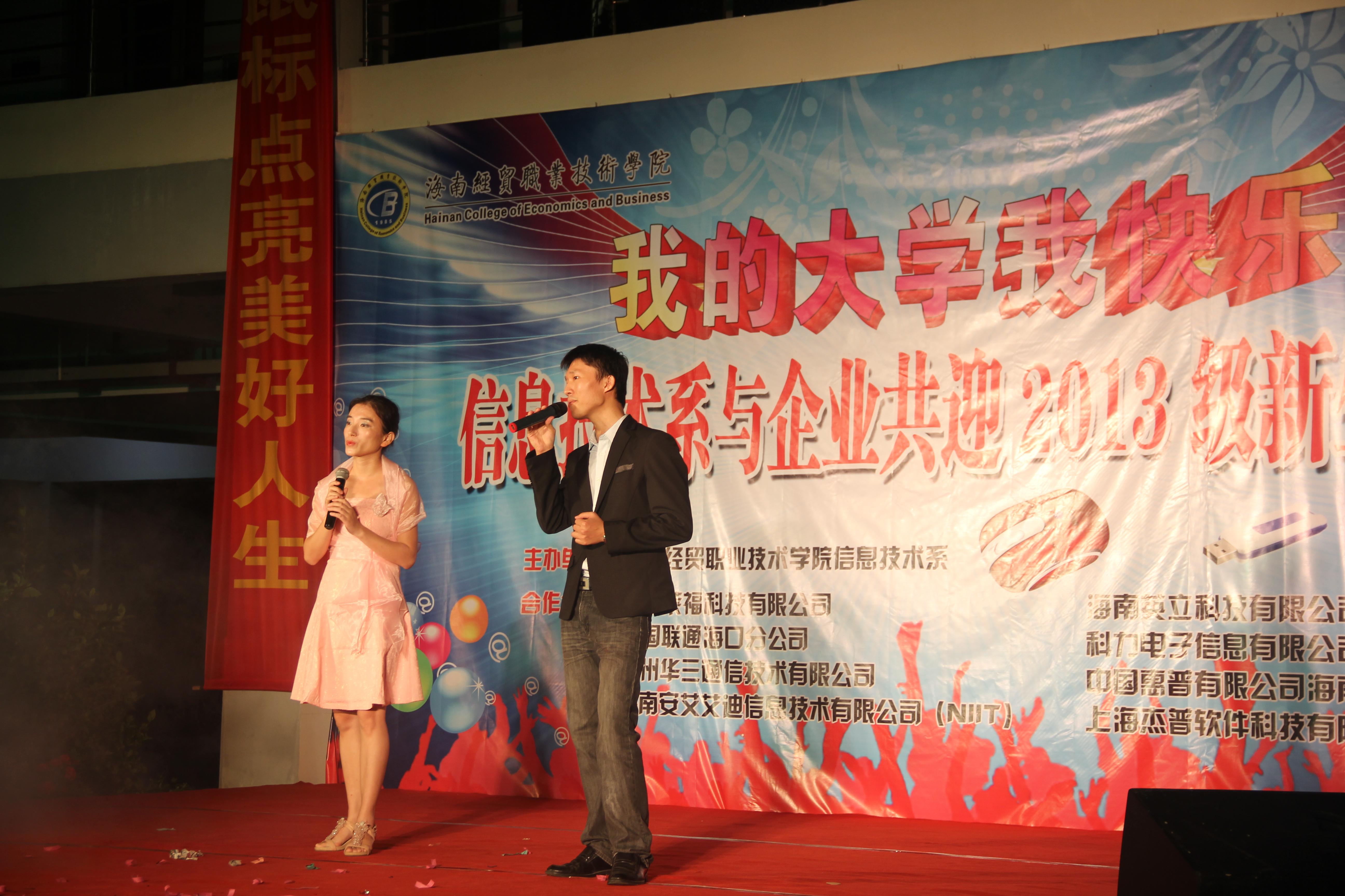 (信息技术系宣教部报道)9月27日晚8点整,信息技术系在二栋教学楼楼下以“我的大学我快乐”为主题举办信息技术系与企业共迎2013级新生晚会,特约嘉宾有:我系党总支书记陈继敏,系主任李丽蓉,系副主任王凡帆、计算机网络技术专业负责人王岩、电子商务专业负责人单继周、计算机多媒体技术专业负责人李兵、员工党支部书记陈亚芳、辅导员陈青云、龙腾老师,另外还有我系各个专业的老师出席晚会现场。出席本次迎新晚会的企业有中国联通海南分公司、杭州华三科技有限公司、海南安艾艾迪有限公司、海南莱福科技公司、海南英立科技有限公司。