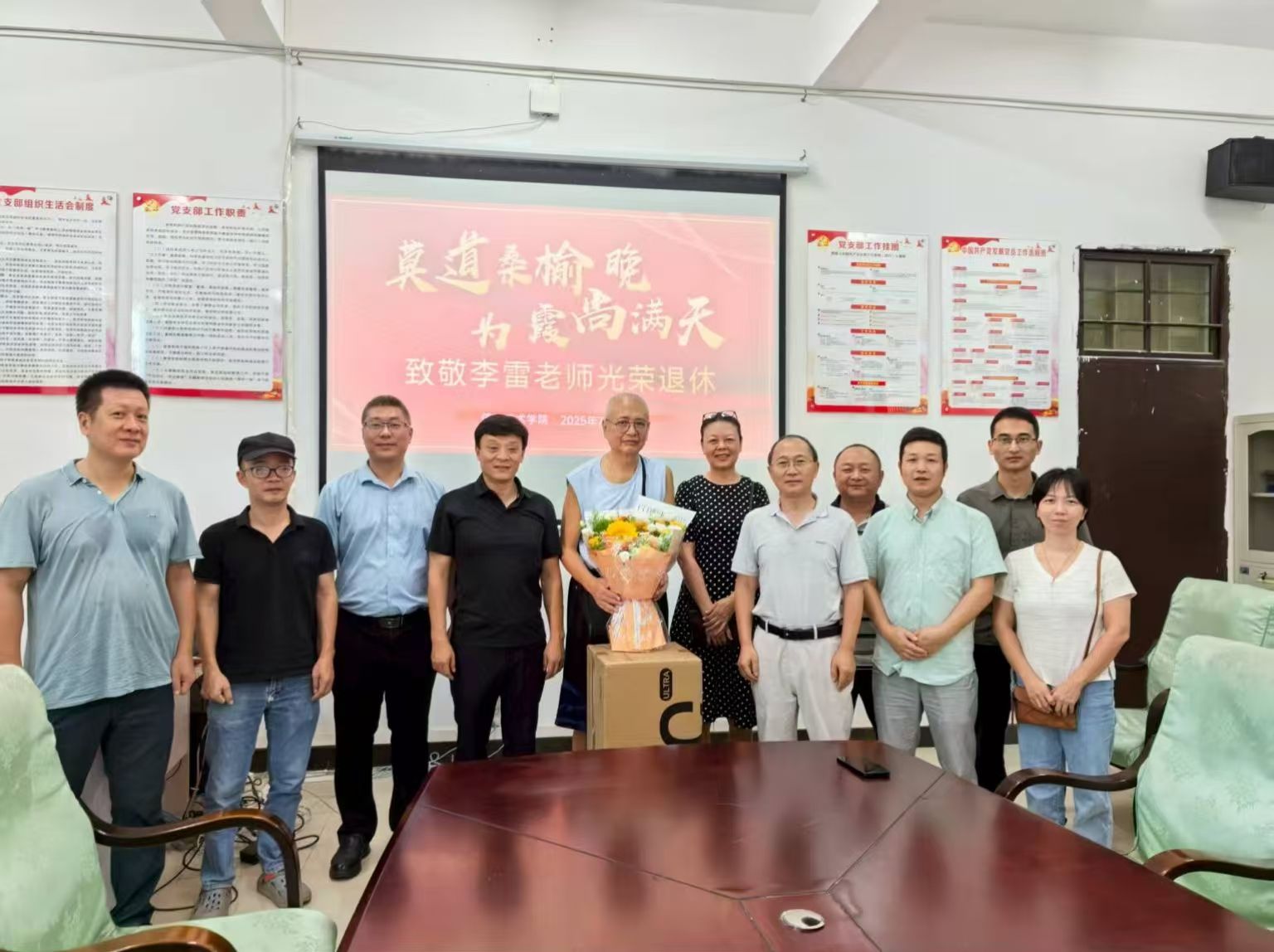 2025年7月25日上午9时,bevictor伟德国际在4-213会议室为李雷老师举办了一场温馨而庄重的退休欢送仪式,以表彰其20年来为公司发展做出的杰出贡献,并送上对其未来生活的美好祝福。仪式由公司副经理康东主持,党总支副书记黄守官、副经理单继周和各专业负责人及教务办人员参与。
