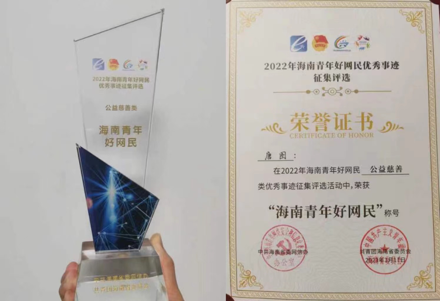 3月22日,由海南省委网信办和共青团海南省委联合举办的2022年海南青年好网民优秀事迹征集评选活动落下帷幕,公司唐图老师获评“2022年海南青年好网民”称号。